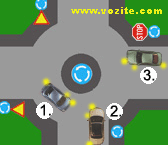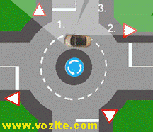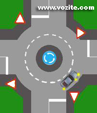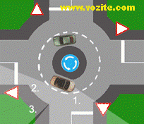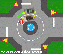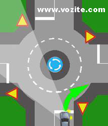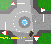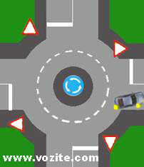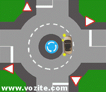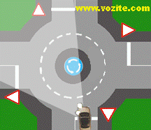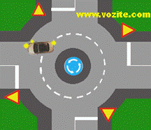 Slika pokazuje kada vozac, nakon usporavanja, provere i najave zeljene radnje, nailazi na raskrsnicu sa kruznim tokom saobracaja koja je regulisana.