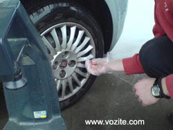 Kada je vozilo podignuto, odviti vijke do kraja, zameniti tockove i ponovo staviti vijke.Vijke treba dotezati do kraja - koliko moze rukom (kljucem), bez prevelike upotrebe sile.