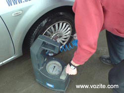 Sam cin provere vrsite sa uredjajem prikazanim na slici, naravno postoje i veci i drugaciji uredjaji, ali ovakav (prenosivi) uredjaj je najzastupljeniji. Crevo uredjaja (kraj creva) postavite na ventil pneumatika, i to na takav nacin da sam vrh ventila sa svojih 5mm udje u odgovarajuci otvor na kraju creva, zatim dobro pritisnite. Vazno je dobro pritisnuti i pogoditi ugao jer se ne sme cuti ''sistanje'' vazduha, odnosno, ispumpavanje pneumatika. Kada ste to uradili ocitajte na pokazivacu - skali, koliki je pritisak vazduha na tom pneumatiku. Pritisak je izrazen u mernoj jedinici - bar. Sa tasterima (-) i (+) na uredjaju podesite zeljeni pritisak. Vazna napomena: kada ste pritisli zeljeni taster (-) ili (+) na uredjaju, nakon kraceg pritiskanja - drzanja morate ga otpustiti da bi ponovo ocitali pritisak na pneumatiku, tako radite nekoliko puta dok ne dobijete zeljenu vrednost.
